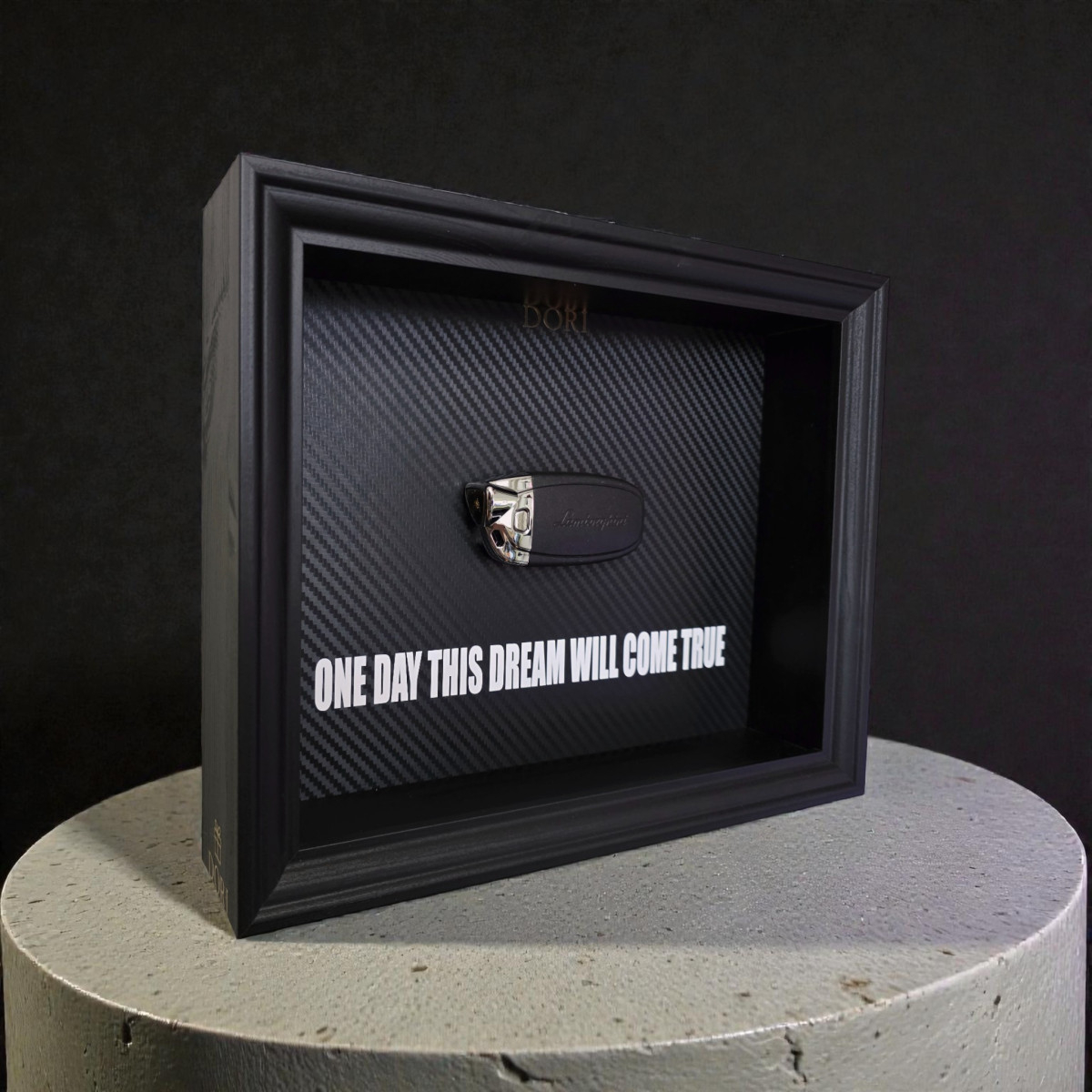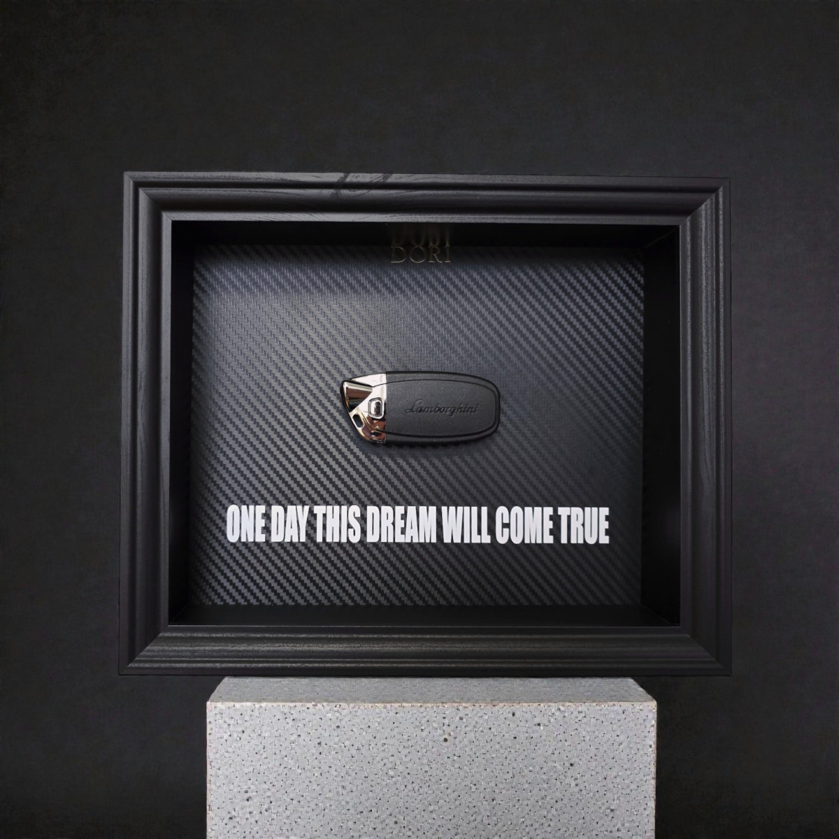 Šis DORI kolekcijos paveikslas su Lamborghini raktu įrėmintas naudojant aukštos kokybės stiklą ir solidų juodą rėmą. Anglies pluošto stiliaus fonas ir ryški frazė leidžia žinutei kalbėti už save – svajok drąsiai, siek atkakliai, kibirkštimi keisk savo realybę.