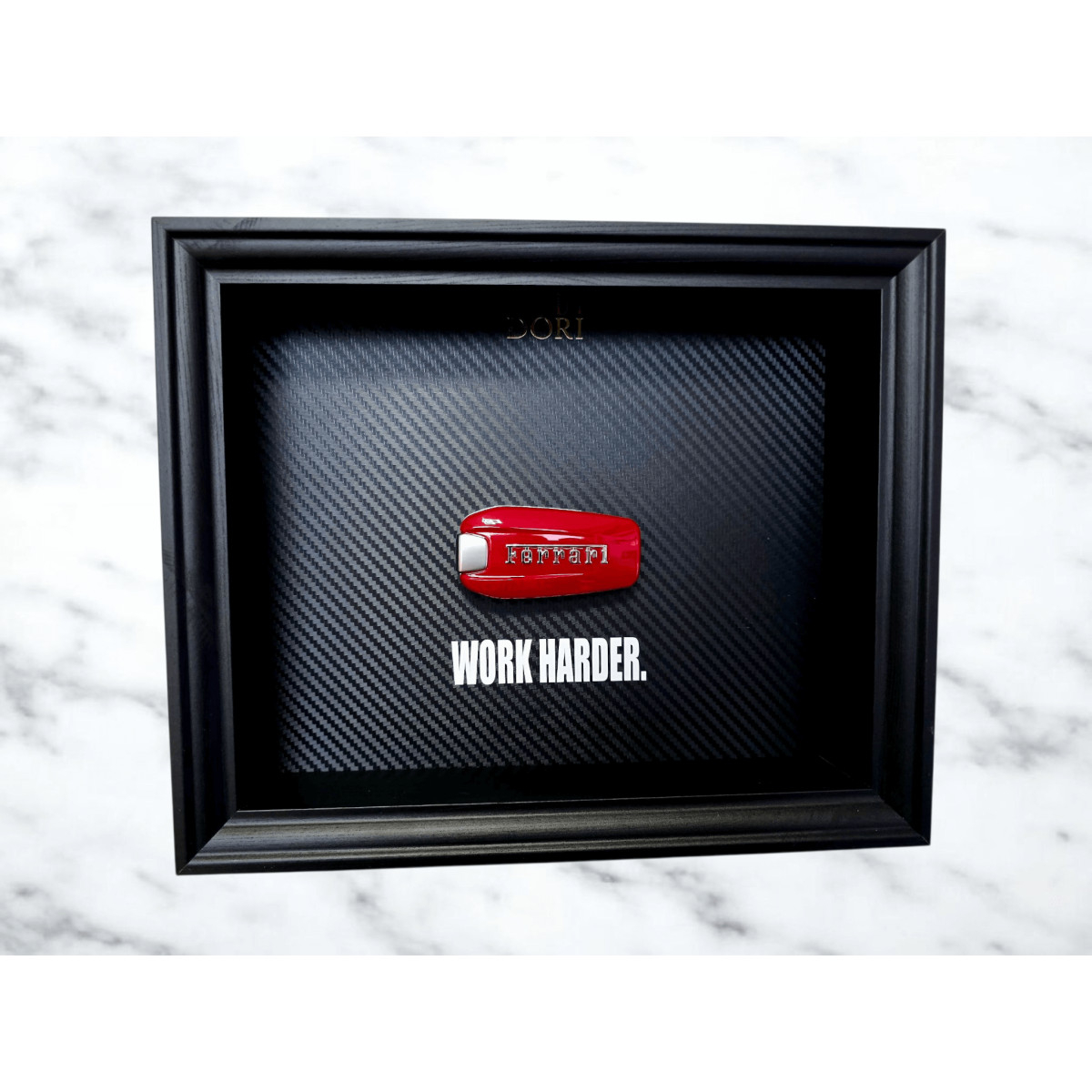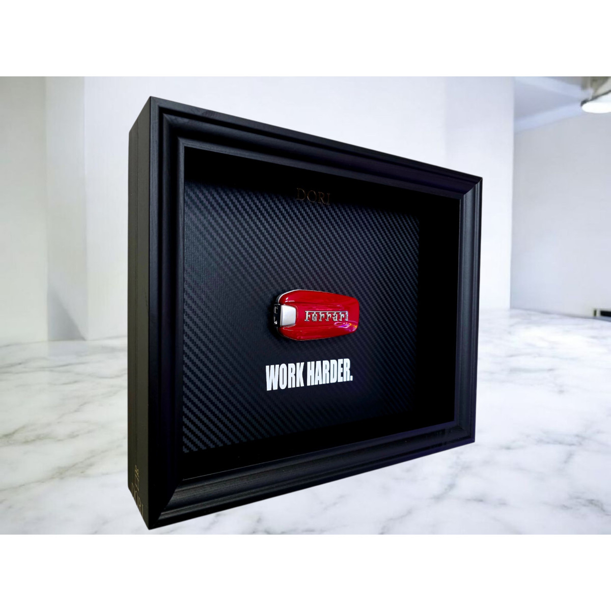Šis DORI kolekcijos paveikslas su Ferrari raktu sukurtas ieškantiems išskirtinumo. Juodas, giliai profiliuotas rėmas, anglies pluošto imitacijos fonas ir nepriekaištinga kompozicija leidžia žinutei kalbėti pačiai už save – be perteklinių detalių, tik esmė: dirbk daugiau, siek daugiau, gauk daugiau.