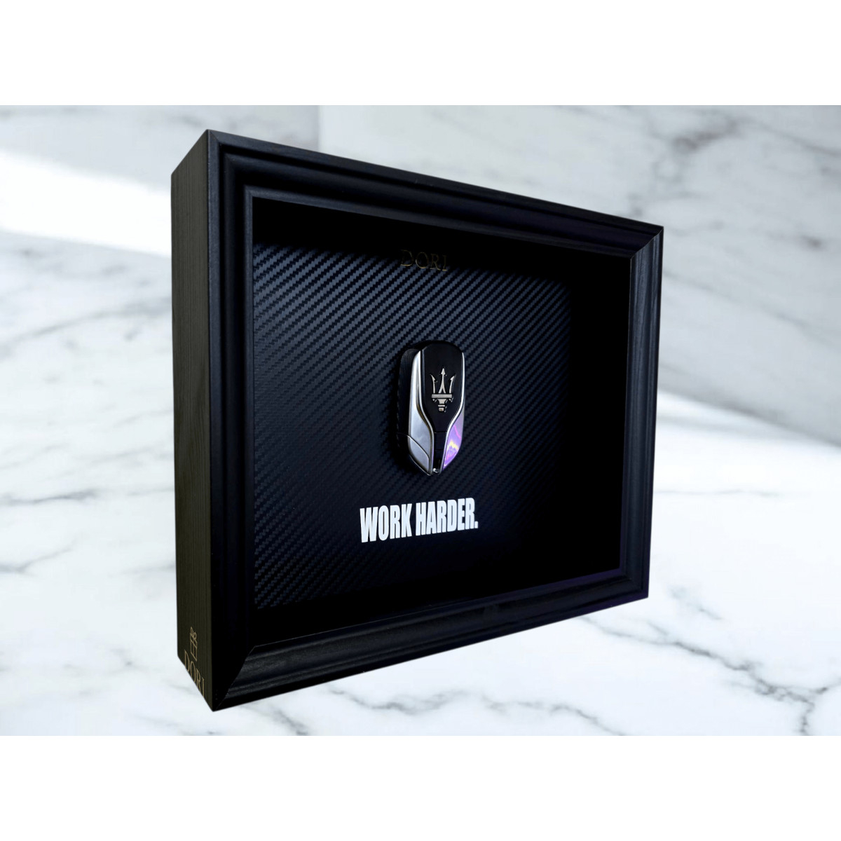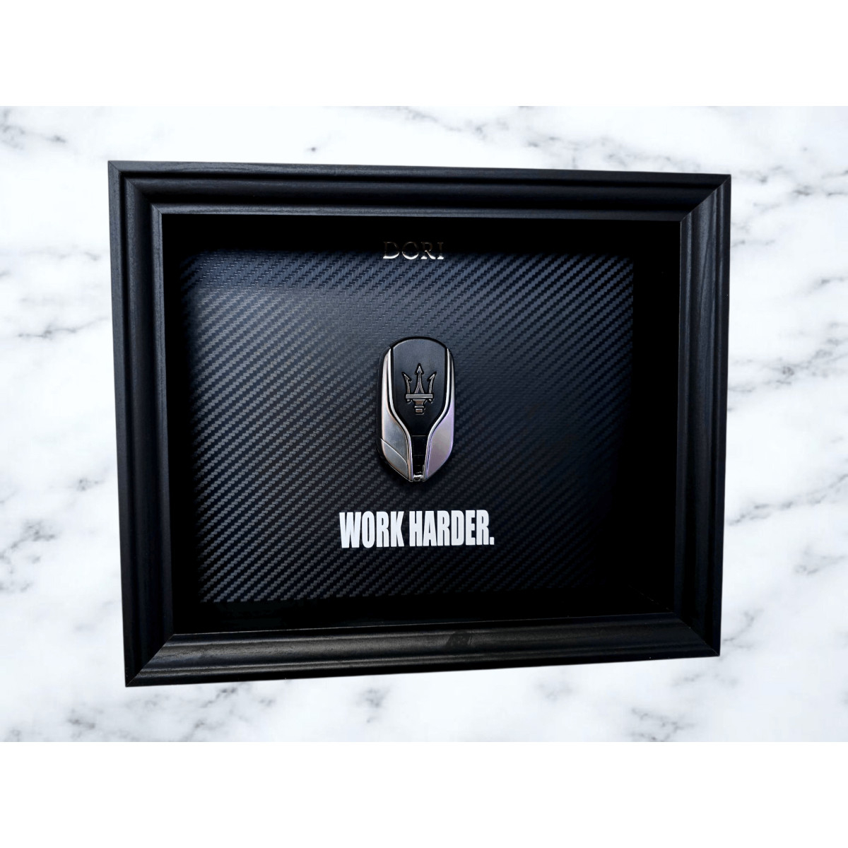 Šis DORI kolekcijos paveikslas su Maserati raktu sukurtas kaip priminimas, kad tik atkaklus darbas kuria išskirtinius rezultatus. Anglies pluošto tekstūros fonas, gilus juodas rėmas ir tikras raktas sukuria prabangų ir ryškų akcentą, kuris traukia žvilgsnį, o minimalistinis dizainas leidžia žinutei kalbėti tiesiai: darbas yra tavo variklis.