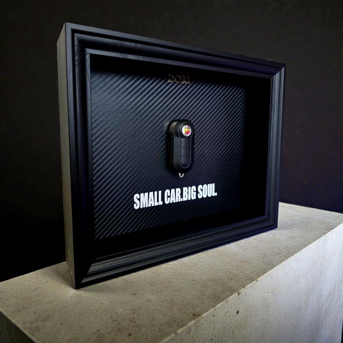 Fiat Abarth raktas tampa pagrindiniu akcentu anglies pluošto rašto fone, kuris suteikia sportiškumo ir galingo charakterio pojūtį. Šis paveikslas puikiai tiks Abarth entuziastui, garažo sienai, darbo vietai ar kaip labai asmeniška motyvacinė dovana.