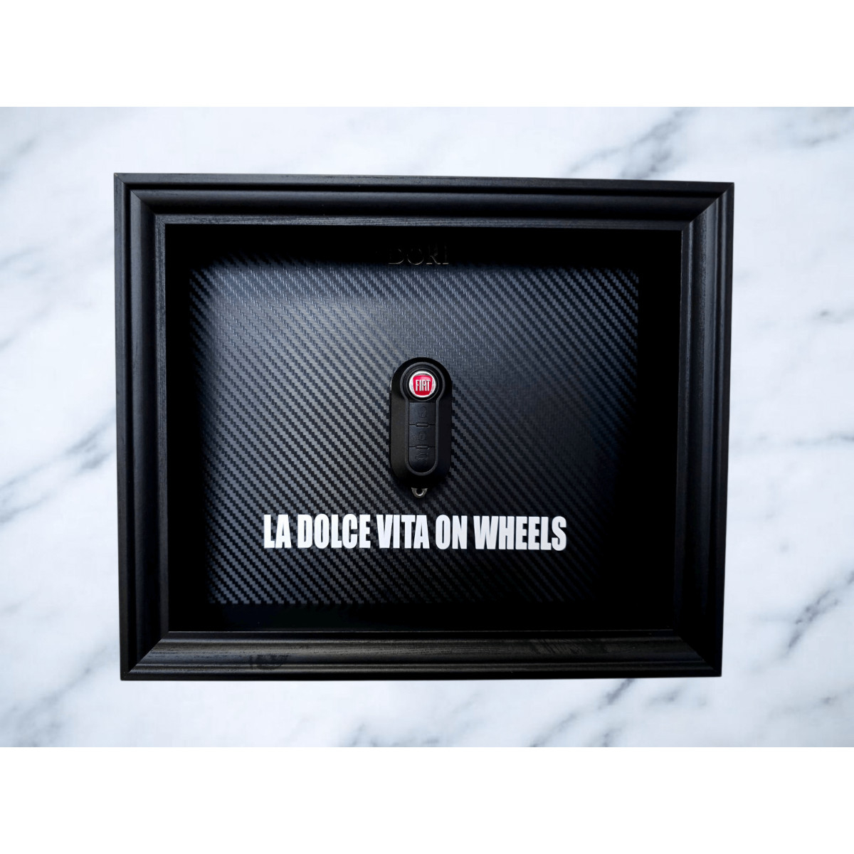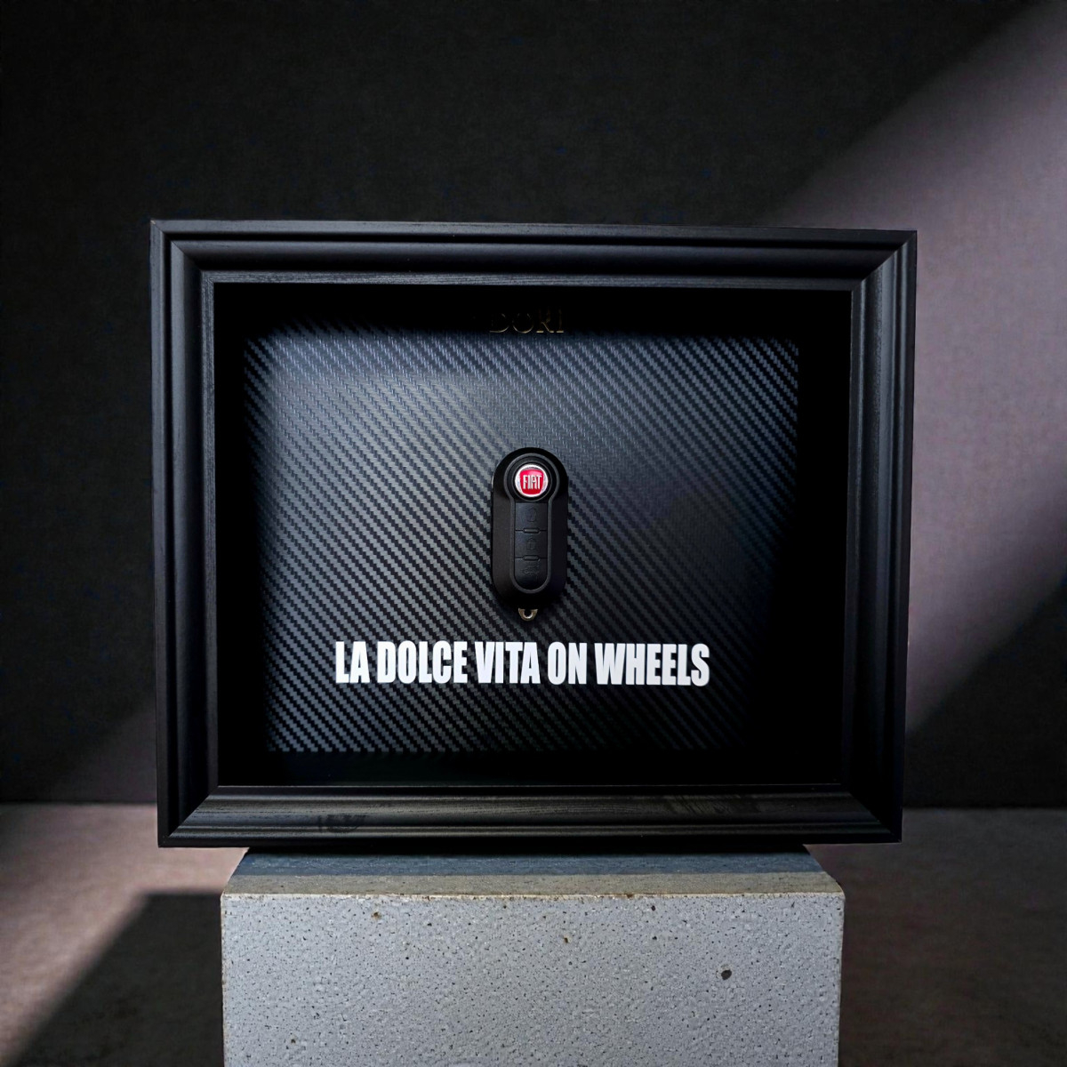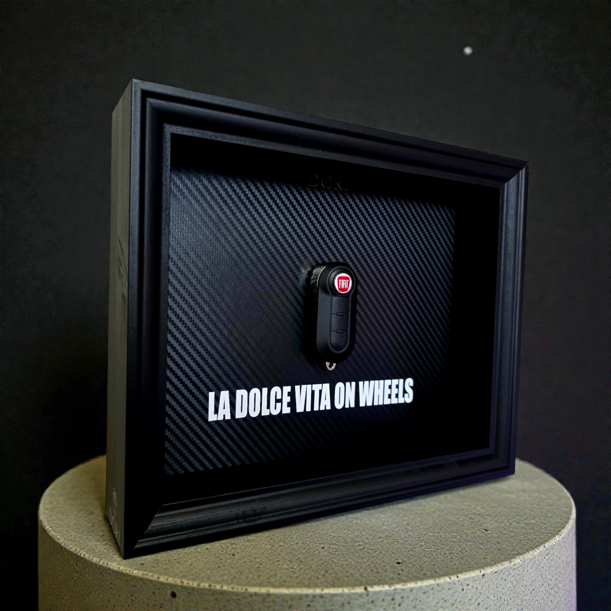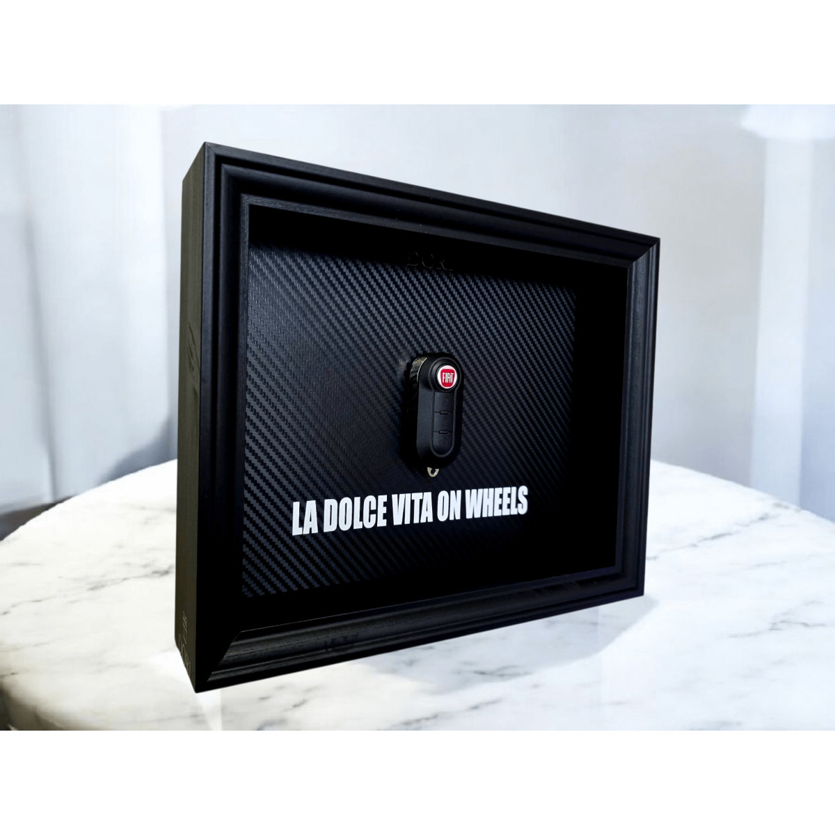 Paveikslo centre įkomponuotas Fiat automobilio raktas, išryškintas anglies pluošto rašto fone, suteikiantis modernų, elegantišką ir minimalistinį įvaizdį. Tai puikus akcentas namams, darbui ar garažui, taip pat ideali dovana Fiat mylėtojui.