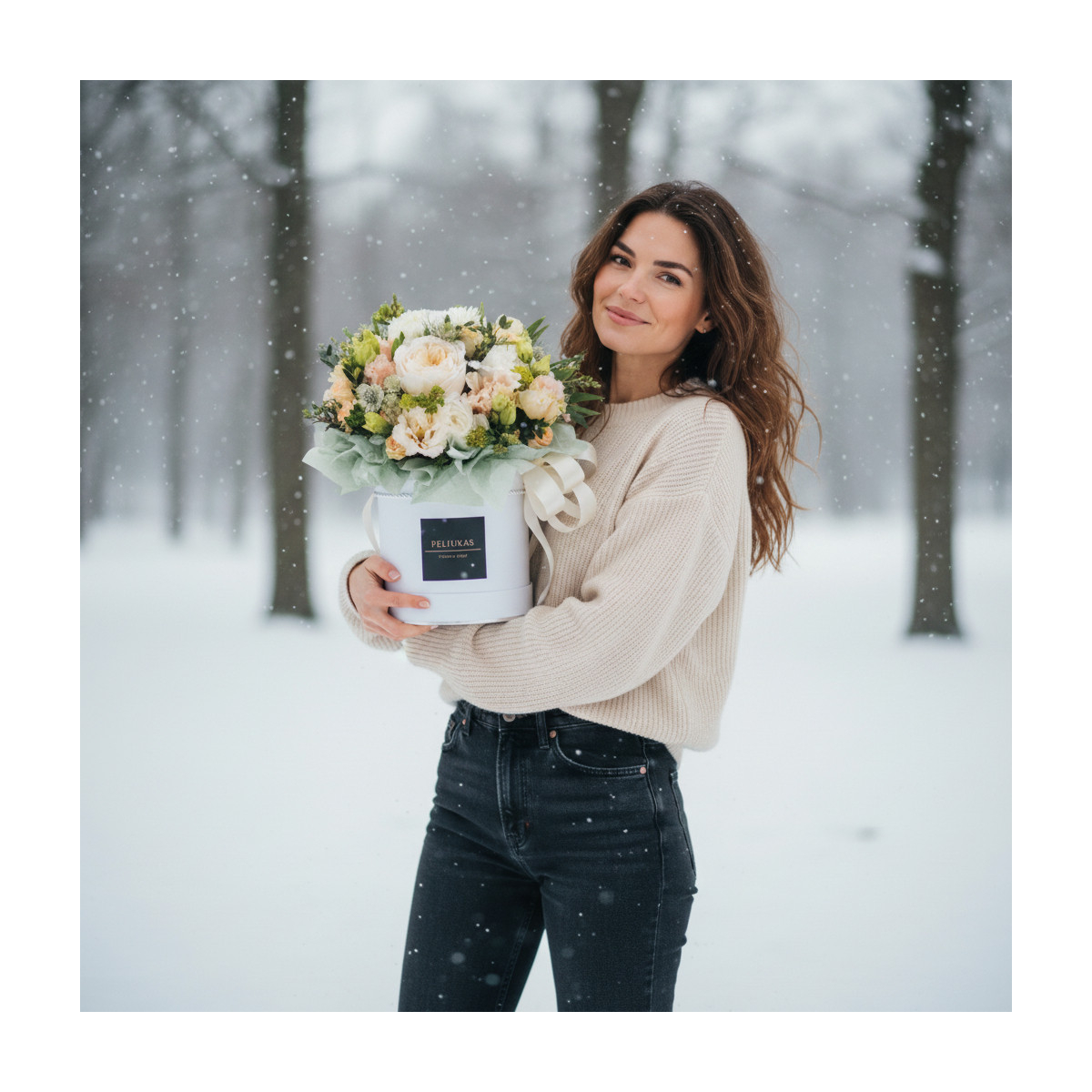 *SVARBU! Nuotrauka pateikiama, kaip pavyzdys, gėlių rūšis arba spalva (išlaikant piniginę vertę) ir dėžutės ypatybės, pagal sezoniškumą ir tuo metu turimą gėlių asortimentą, gali keistis. Floristika – kūrybinis ir dinamiškas procesas, neįmanoma dukart paruošti tokios pačios kompozicijos. Nuotraukoje pavaizduotas XL dydis.