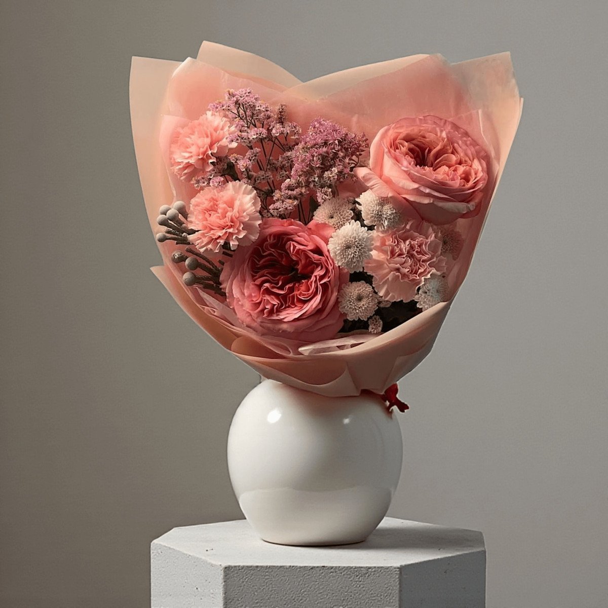 „Blush Morning“ – tai švelni, romantiška rožinių, persikinių ir baltų tonų puokštė, spinduliuojanti lengvumą ir pavasario šilumą.