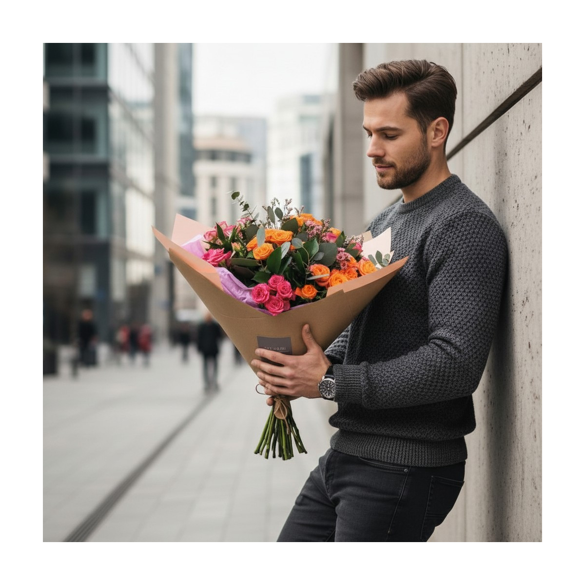 *SVARBU! Nuotrauka pateikiama, kaip pavyzdys, gėlių rūšis arba spalva (išlaikant piniginę vertę) ir pakuotė, pagal sezoniškumą ir tuo metu turimą gėlių asortimentą, gali keistis. Floristika – kūrybinis ir dinamiškas procesas, neįmanoma dukart paruošti tokios pačios kompozicijos. Nuotraukoje pavaizduotas XL dydis.