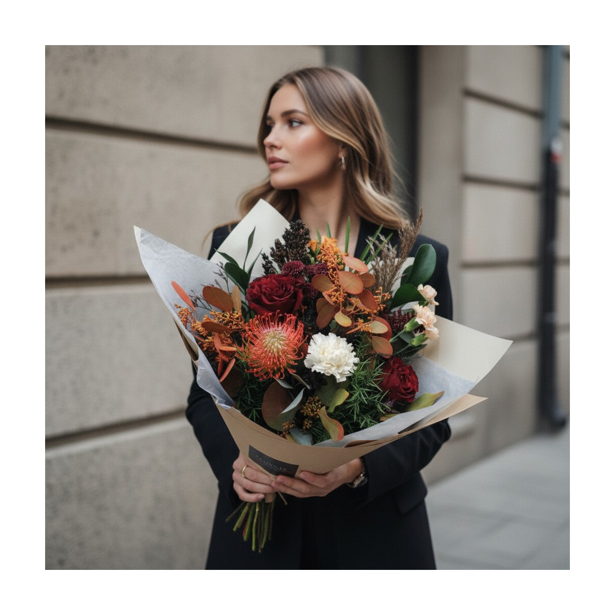 *SVARBU! Nuotrauka pateikiama, kaip pavyzdys, gėlių rūšis arba spalva (išlaikant piniginę vertę) ir pakuotė, pagal sezoniškumą ir tuo metu turimą gėlių asortimentą, gali keistis. Floristika – kūrybinis ir dinamiškas procesas, neįmanoma dukart paruošti tokios pačios kompozicijos. Nuotraukoje pavaizduotas L dydis.