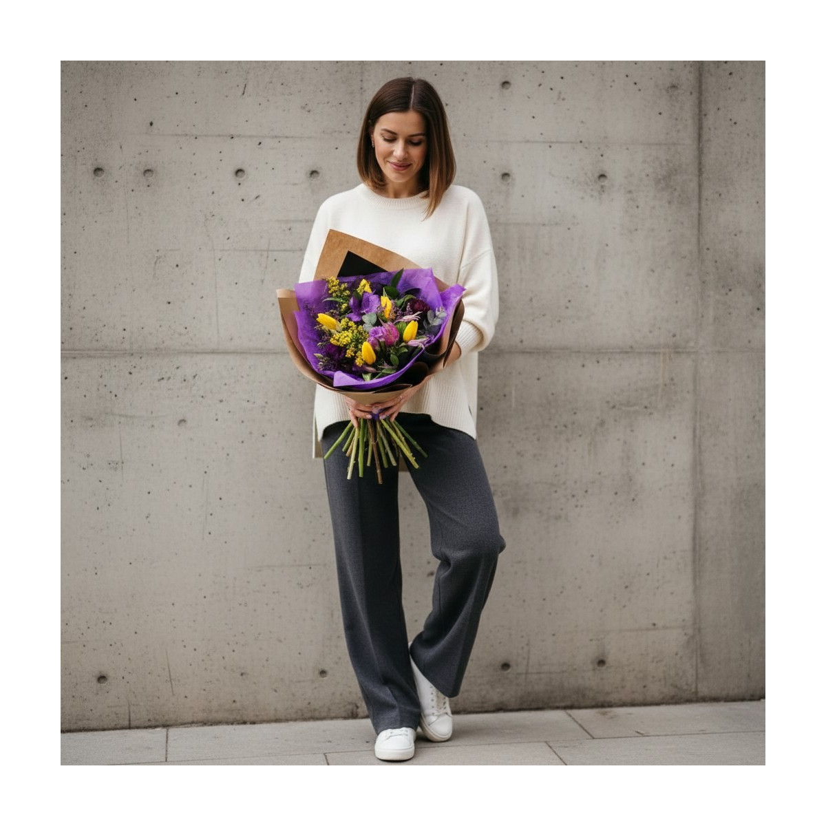 Geltonų ir violetinių atspalvių gėlės derinamos su žaluma ir lengvais dekoratyviniais priedais, sukuriant gyvybingą, pavasarišką ir natūralios pievos įkvėptą kompoziciją.