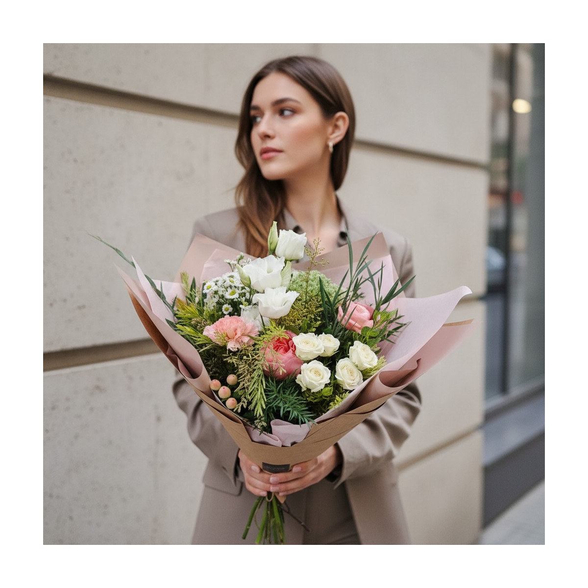 „Laimės inercija“ – subtili ir šviesi gėlių puokštė iš Green Line kolekcijos, kurioje susijungia natūrali žaluma, rožinių ir baltų atspalvių žiedai bei lengva, natūrali kompozicija.