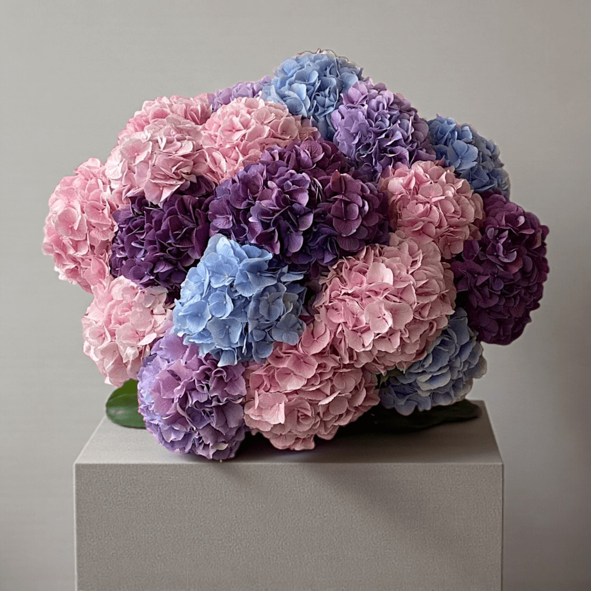 Nuostabi dovana! Įvairiaspalvių hortenzijų puokštė. Su meile paruošime Jūsų užsakymą! Jeigu turite pageidavimų, būtinai juos palikite komentare.