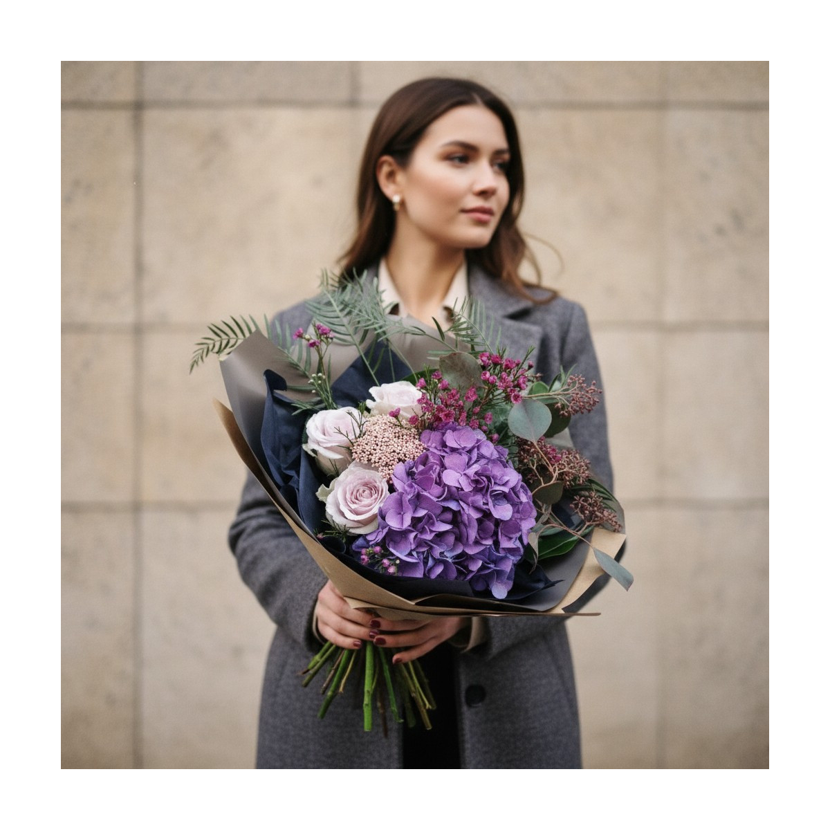 „Paslaptingoji“ – tai elegantiška ir harmoningai subalansuota puokštė, kurioje dera švelnios rožės, hortenzijos (spalva gali skirtis) ir gausi žalumos įvairovė.