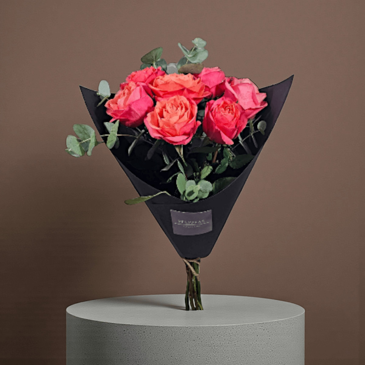 „Paris“ – elegantiška ryškių rožių puokštė, papildyta švelnia žaluma ir supakuota į modernų spalvotą vatmano popierių. Šis įpakavimas suteikia puokštei prabangos, tvarkingos formos ir šiuolaikiško stiliaus įspūdį.