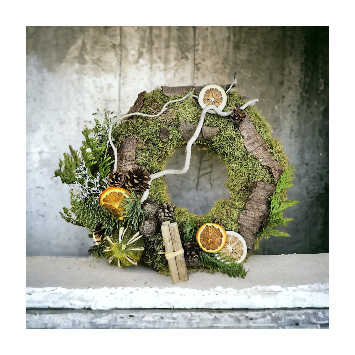 Šis vainikas kuriamas naudojant samanomis dengtą pagrindą, žievės gabalėlius, miško žalumynus, kankorėžius, džiovintus citrusus ir kvapnius cinamono pagaliukus.