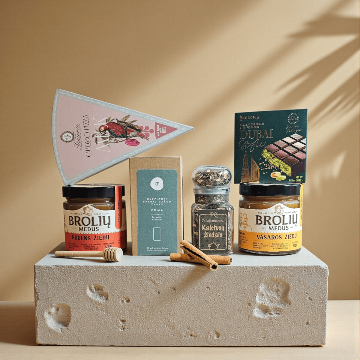 Dovanų rinkinys yra supakuotas į kraft dovanų dėžutę su langeliu.