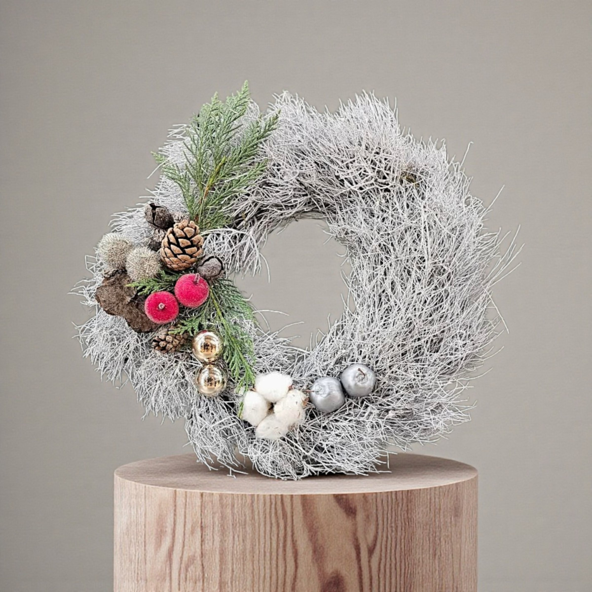 Kalėdinis vainikas „Žiemos Uoga“ – tai išraiškingas, natūralus ir jaukus žiemos akcentas, kuriame subtiliai dera šerkšno lengvumas ir šventinė šiluma. Purus baltai pilkas vainiko pagrindas primena žiemos mišką, padengtą pirmuoju sniegu, o dekoracijų kompozicija priduoda charakterio ir gyvybės.
