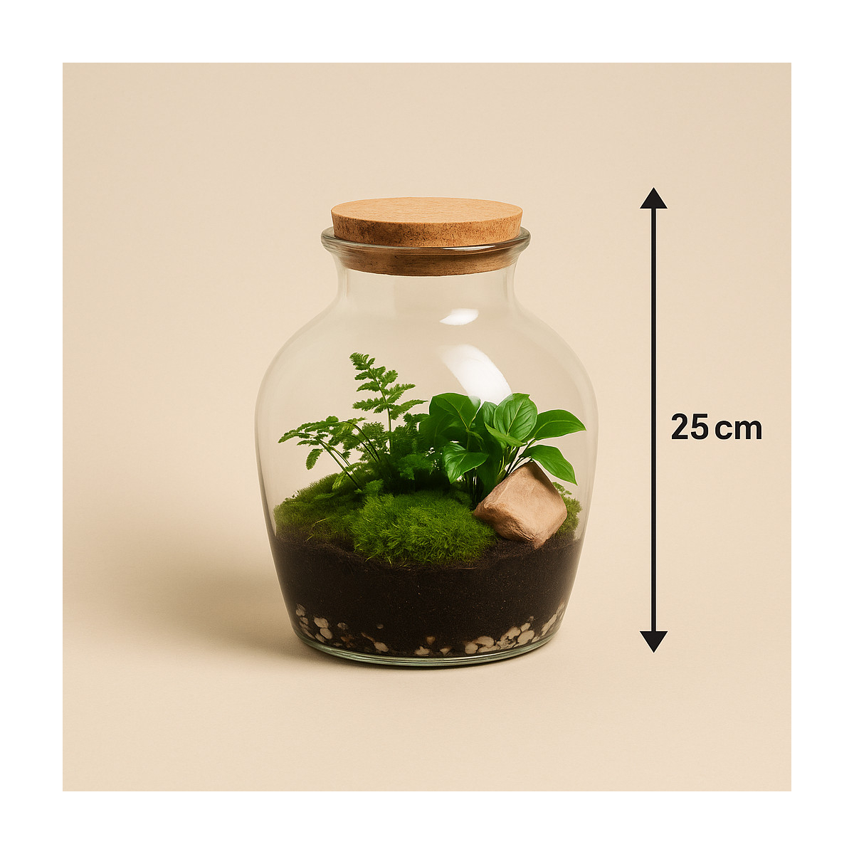 Šis rankų darbo augalų terariumas „Žalias pasaulis“ – tai mažas, gyvas gamtos pasaulis stikliniame inde su natūralaus kamščio dangteliu. Terariumas kuriamas kaip uždara mini ekosistema, kurioje augalai, drėgmė ir oras sudaro natūralų, savarankiškai funkcionuojantį ciklą.