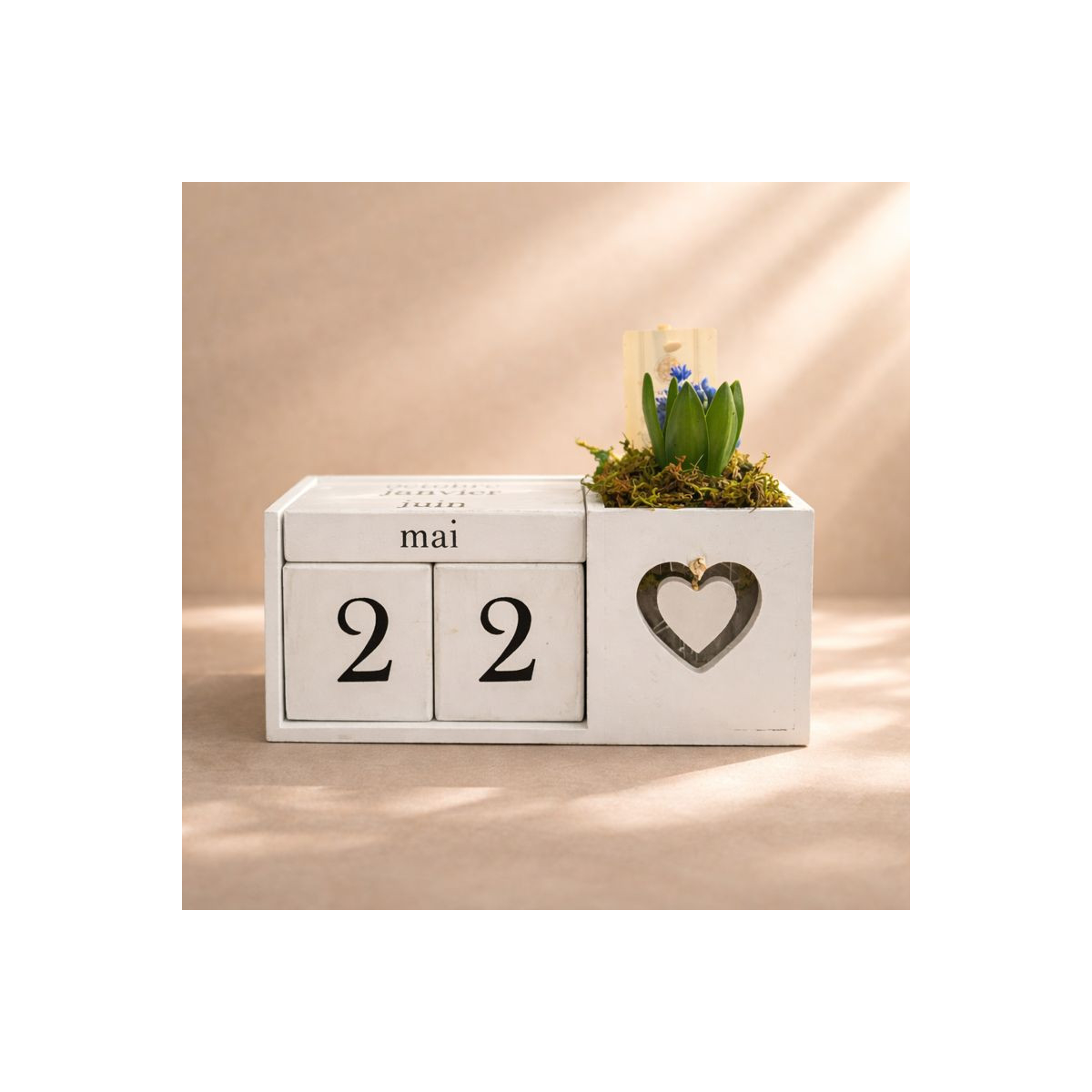 Kalendoriaus elementas leidžia lengvai keisti datą, todėl ši kompozicija tampa ne tik dekoracija, bet ir praktišku kasdieniu aksesuaru. Augalas pasodintas dekoratyviniame vazonėlyje su natūraliomis samanomis, kurios pabrėžia natūralumą ir rankų darbo pojūtį.