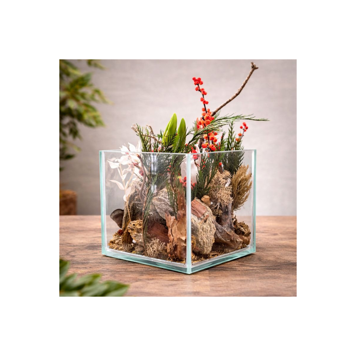Natūralios šakos, samanų fragmentai ir dekoratyviniai akcentai sukuria harmoningą, miško įkvėptą nuotaiką. Skaidri stiklinė forma leidžia stebėti kompoziciją iš visų pusių, todėl ji puikiai tinka tiek namų interjerui, tiek biurui ar kaip išskirtinė dovana.