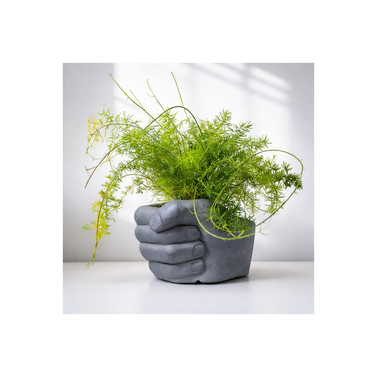 Vazoninis augalas „Gyvybės rankose“ – tai išraiškinga, moderni ir simbolinė interjero detalė, kurioje natūrali augalo gyvybė susilieja su stipria forma. Kompozicijoje pasodintas Šprengerio smidras, pasižymintis lengva, ažūrine žaluma ir natūraliu augimo judesiu.