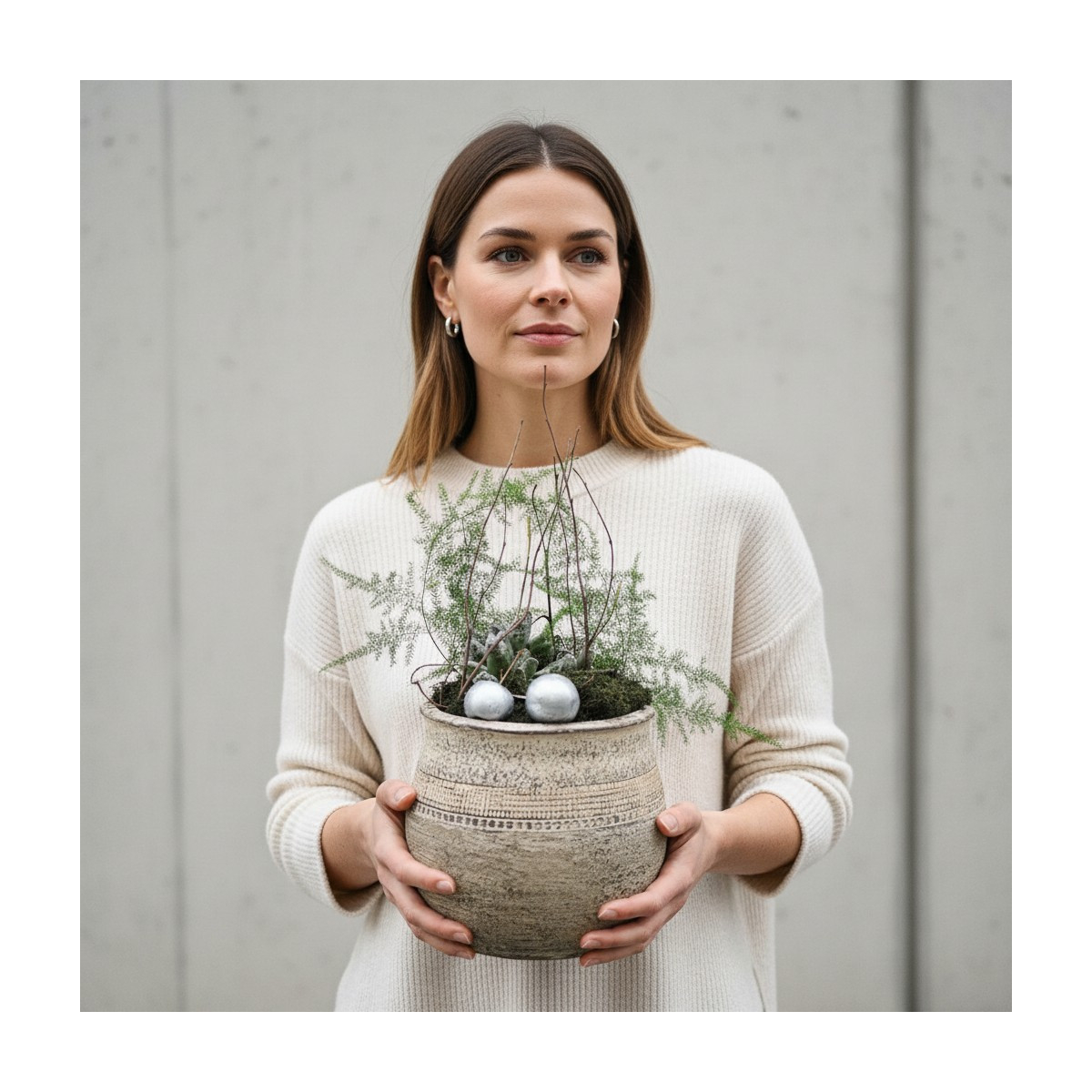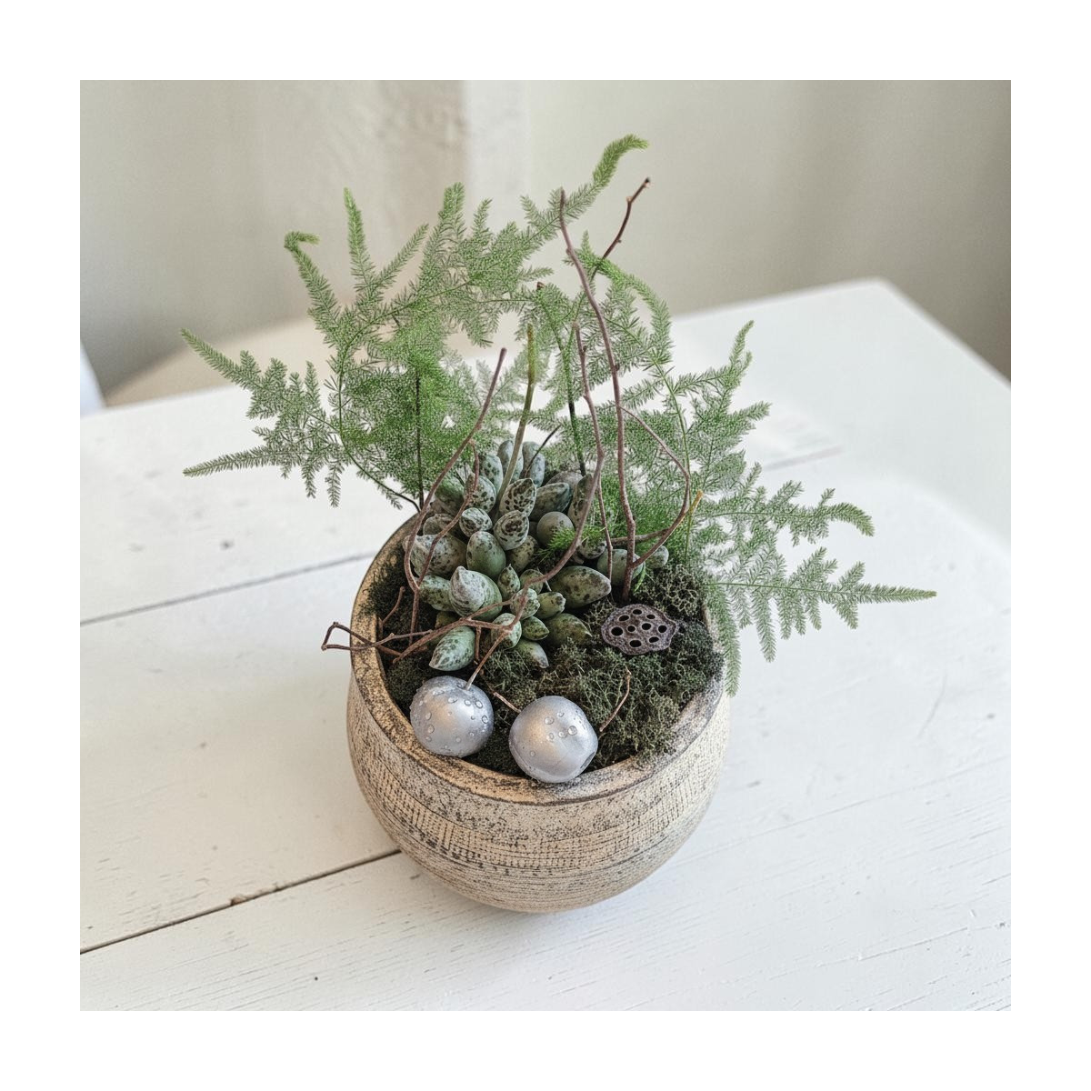 Pastaba: kompozicija ruošiama gavus užsakymą – parenkame sukulentą bei dekoratyvinius elementus iš turimo asortimento, išlaikydami bendrą kompozicijos estetiką ir dydį, todėl detalės gali šiek tiek skirtis nuo pavaizduotų nuotraukoje. Keramikinis vazonas gali skirtis forma, tekstūra ir atspalviu.
